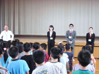「全校朝の会」で,校長先生の話を一生懸命聞いている顔には,今日から頑張ろうという姿勢が感じられました。その中で,教育実習生2名と学生ボランティアの先生の紹介がありました。その後,夏休み中いろいろな大会などでがんばった児童の表彰がありました。