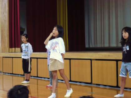 3年生の南大内タイムでは,代表の5人の児童が演劇鑑賞会で感じたことを,身振り手振りも交えて伝えました。