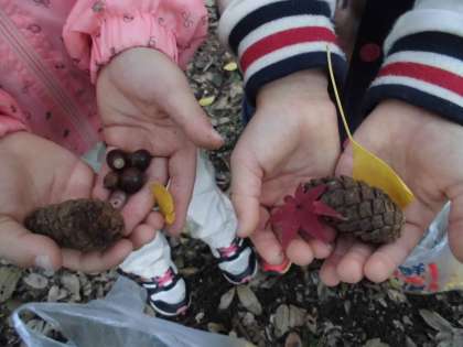 秋も深まり木々の葉が緑・黄・赤にきれいに色づいていました。子ども達はいろいろな色の葉を集めたり,どんぐりを拾ったり,松ぼっくりを拾ったりと楽しく活動していました。