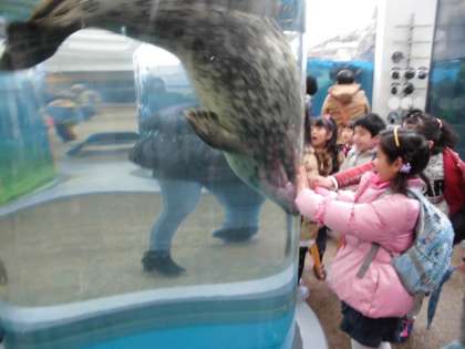 子ども達ははじめの水槽からとても興味深く,水槽に額を寄せて魚を見ていました。イルカパフォーマンスもみんなで見て,楽しいひと時を過ごしました。