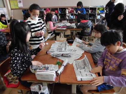 課題は「新聞紙5枚とテープを使って,20分以内になるべく高い建物を作る。」