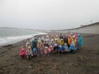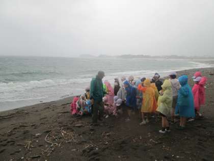 雨の中、大野浜に行きました。昨日と違って天候の悪い日の海を見て、子供たちはビックリしていました。みさきの家に戻りシャワーを使い、夜の野外炊飯までの時間、60畳の部屋でゆっくりと過ごします。