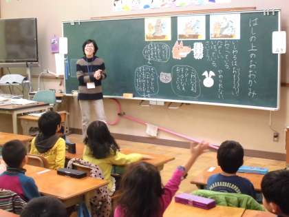 1年生は「はしの上のおおかみ」,2年生は「白いくつ」,3年生は「よかったね とみお君」という授業をしました。