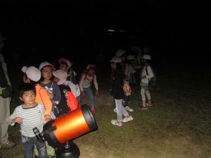 まだ明るい時間のナイトウオーク、そのあと天体観測をしました。みんなで月と木星と火星をさがし、天体望遠鏡で観察しました。今、入浴が終わり、この後就寝となります。みんな元気です。おやすみなさい。