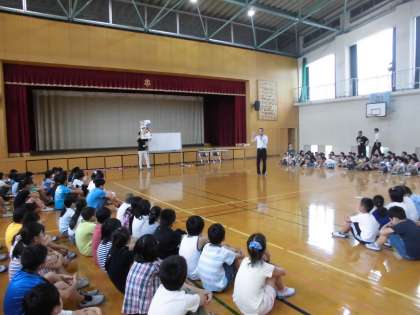緊急放送の後,体育館へ避難し,南警察署の警察官の方々に,「イカのおすし」のキーワードを教えてもらい,さすまたを使って教職員が子どもを守るための訓練をしました。