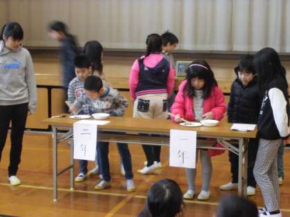 各学級での予選を勝ち上がった代表者が,決められた時間内にお箸でどれだけ豆を移せるかを競いました。