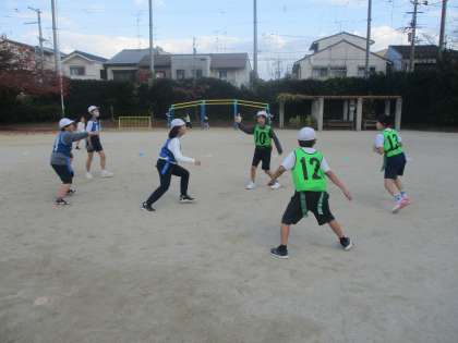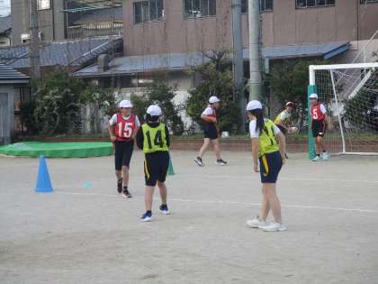 6年生は体育の学習でタグラグビーをしています。はじめの3時間はルールに慣れて楽しむことをめあてに、ゲームをしています。ボールの扱いが得意な人も苦手な人も、守備のときはタグを取るというシンプルなルールのおかげで、みんなで楽しめる時間になっています。