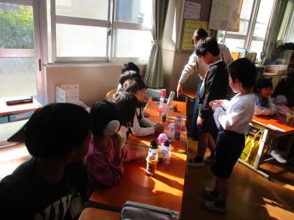 生活科の秋みつけで拾った、どんぐりや松ぼっくりを使ってアクセサリーやマラカスなどを作り、2年生を招待して一緒に遊びました。