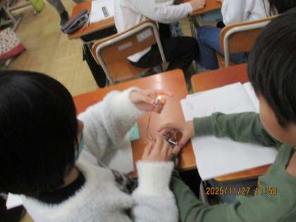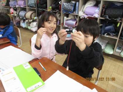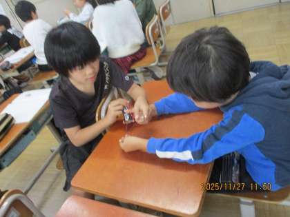 理科はどんどん単元が進みます。この日は乾電池と豆電球と導線が渡されました。どうにかして明かりをつけたいのだけれど・・・友達と協力して、明かりをつけました!簡単に明かりをつけられた子どもたち。すると「ここをこうするとつくけど、これをこうすると・・・つかないんや」などと色々試すお友達がいました。みんなで色々試してとても楽しかったですね。