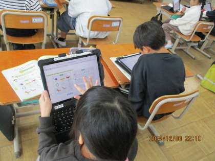 まずは、タブレット端末をつかって、いろいろなリズムの音とそれに合う楽器をためしてみました。次は音楽室にいって、その楽器で実際に演奏をしてみます。楽しい音楽の時間です。