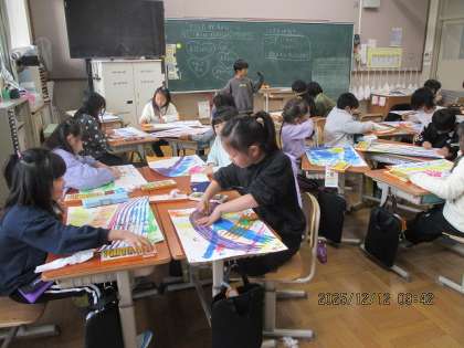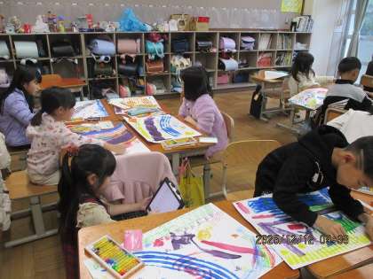 前回、ローラーとスタンプをし、今回は何に見えるか想像を膨らませてパスで絵を描いていきました。「お花畑にしよう!」「宇宙がいい!」とそれぞれにイメージしながら作品作りをしていました。