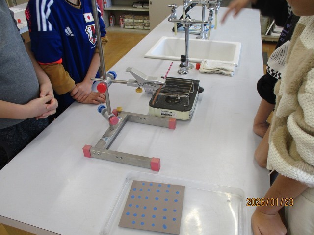 理科の学習ではもののあたたまり方について学んでいます。実験をメインにして楽しく学べています。今回は金属のあたたまり方について実験をしました。熱している部分からどんどんあたたまっていくのが視覚的にわかり、面白かったですね。どの班も先生の説明をしっかり聞き、とても安全に実験ができました。次は水のあたたまり方です!楽しく安全に実験しましょう。