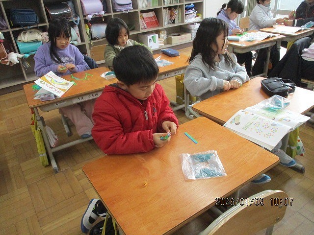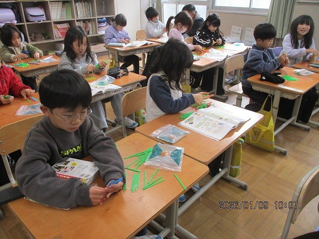 算数は、2桁の大きい数の学習に入りました。数え棒を言われた数だけ並べています。どうしたら見やすくなるか考えて、10のまとまりにすることを学習しました。