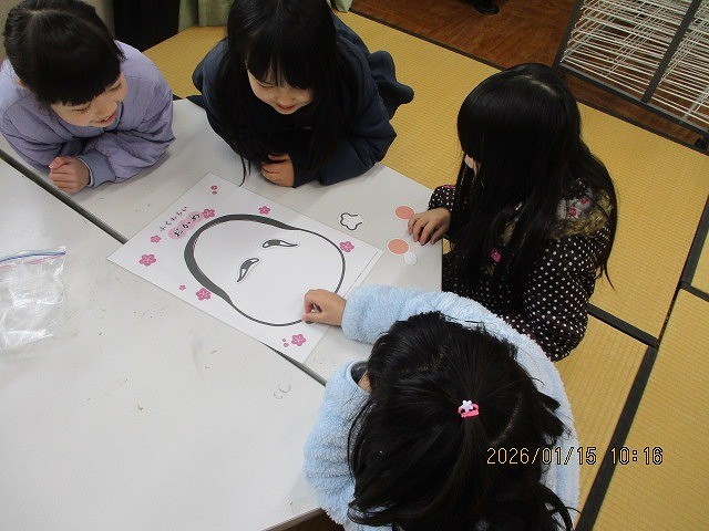 お正月あそびをしました。こま、ふくわらい、かるた、はごいたお手玉などをしてみんなで楽しみました。