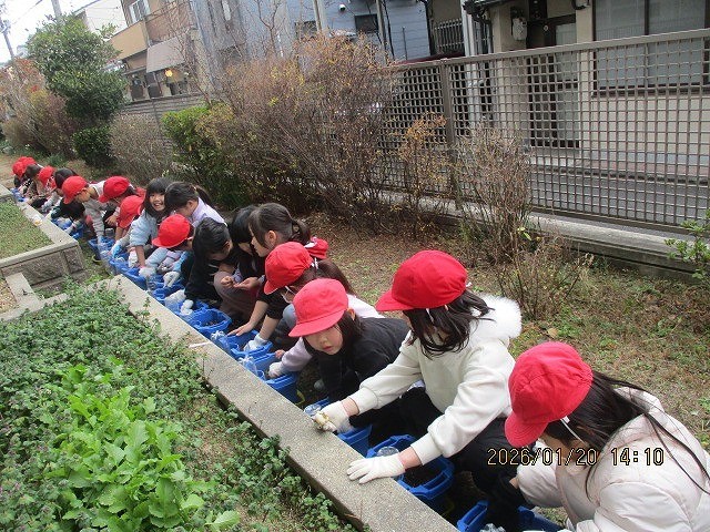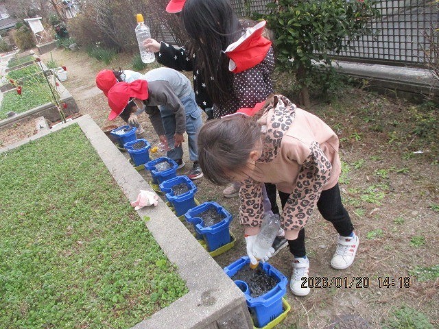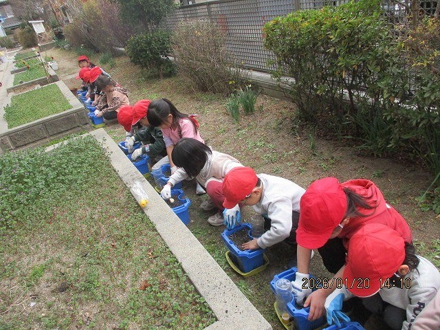 春に咲く花、チューリップの球根を植えました。何色のチューリップが咲くかはお楽しみ♪さっそく水やりをして「ちゅーりっぷさん、早く大きくなってね!」と呼びかけていた姿がとてもかわいかったです。早く活動できるように話を聞いたり、土を入れるときに順番に並んだりすることもできていて立派でした。