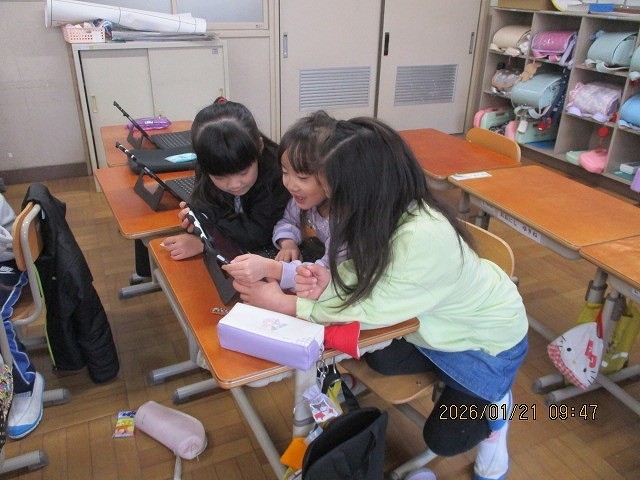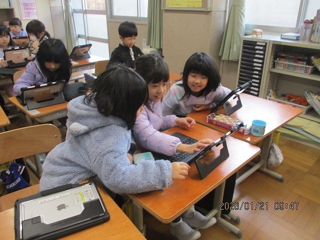 iPadで図画工作で仕上げた作品の鑑賞をしました。どんな絵を描いたか話したり、友だちの作品のよいところを伝えたりしました。