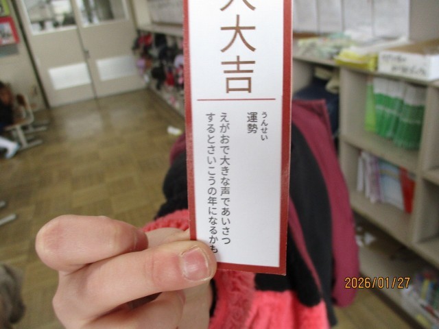新年ということで児童会の5、6年生が主催してくれているおみくじを引きに行きました。体の半分くらいのサイズの大きな大きなおみくじをひけて、それだけでご利益がありそうな感じがしました。中吉や小吉などに加えて、大大吉や福吉、スペシャル大吉などのめずらしいおみくじもありました!今年一年そのおみくじに書かれていることを信じて頑張りましょうね。