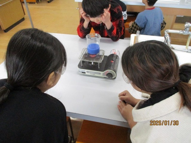 先日の理科の実験では金属のあたたまり方を学習しましたが、今回は水のあたたまり方について学習をしました!温度が上がると色が変わるようになっている水を使って実験をしました。換気が必要なため、寒い中でしたが今回も安全に実験ができてよかったです。今後も安全を第一に実験を楽しみましょう!また記録やまとめもきちんと書けました。深い学びにできましたね!
