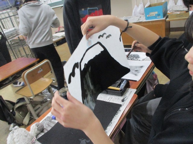 6年生は図工で「墨絵」をかきました。「墨絵といえば?」と子どもたちに聞いてみると、皆「雪舟!」と答え、歴史での学習を思い出していました。墨絵では墨の黒い色しか使うことができませんが、水の量や筆の使い方を工夫することで様々な表現ができます。