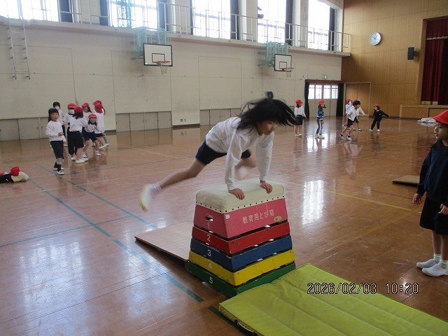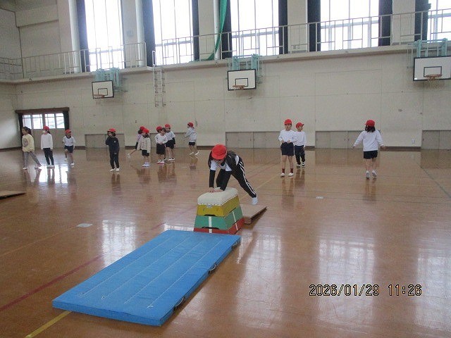 跳び箱あそびの学習が始まりました。1年生は、開脚とびだけでなく、跳び箱の上に乗ったりまたいで下りたりしながら、跳び箱に慣れていきます。「踏切版をばーんって踏むといいよ。」「手を前の方についたらいいよ。」とコツを上手に教えてくれる人もいます。楽しく慣れていってほしいです。