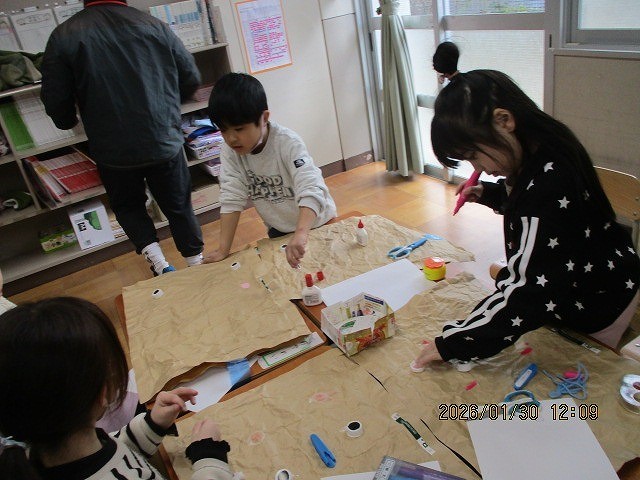 紙袋をくしゃくしゃにして、ぱくぱくしたら何に見えるか想像しました。イメージに合わせて飾りをつけて作品を作ります。図工展で見ていただく予定です。