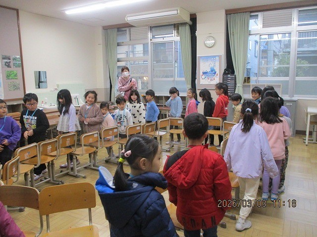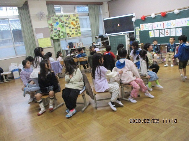東寺保育園の年長さんを招待した「あたらしい1年生をむかえる会」です。年長さん一人一人に名前を書いたメダルをかけてあげました。3月3日だったので、みんなで「ひなまつり」の歌を歌って、全員でいすとりゲームをしました。最初はかなり緊張した様子でしたが、いすとりゲームで緊張がほぐれて残っている友達にたくさんの声援が掛けられていました。