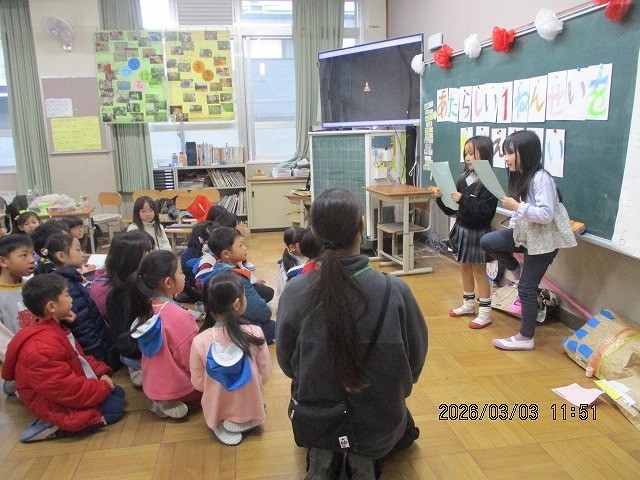 読み聞かせや、ひらがな体験、学校探検、カルタ取り、時間割紹介など、小学校のことが分かるコーナーを回ってもらいました。「もっと遊びたい!」と時間が足りないくらいあっという間でした。終わりの言葉もしっかりと決めてくれて、4月からしっかりと優しく新しい1年生に関わってくれる彼らが目に浮かびました。
