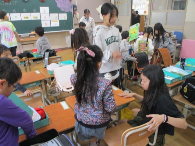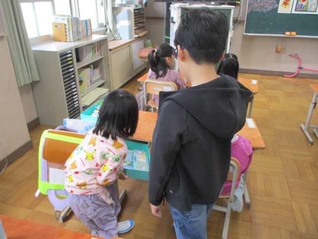 1年生のペースに合わせながらも、「次は○○をするよ」「△△は机に出した?」と優しく1年生に話しかけてくれていました。