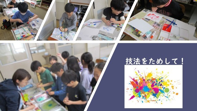 今日の学習は、ストローで吹く・筆を振って垂らす・網でこする・写し取るなどいろいろな技法を試しながら、自分のオリジナルTシャツを描きました。