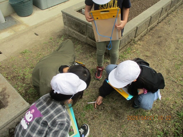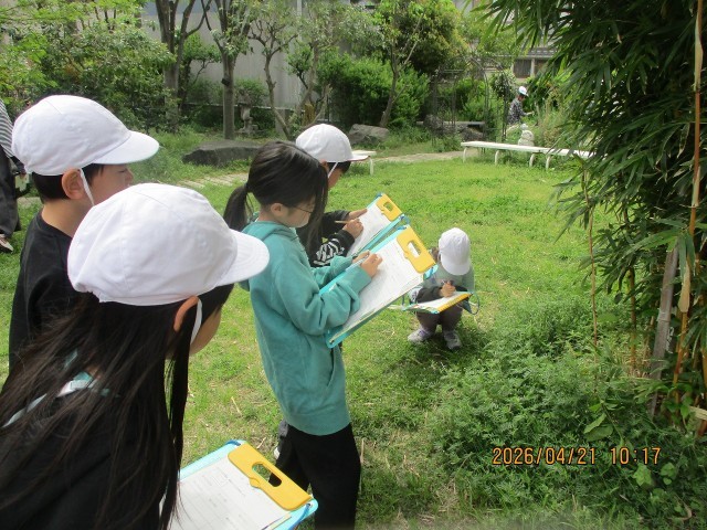 「今日は雨上がりやからか、チョウがいないな」「あっ!ダンゴムシ発見!」「これ先生が言ってたキュウリグサかな」「キュウリのにおいがする!」「これはホトケノザやな」「違うで!葉っぱの形が違うやん!」など色々見つけ、発見していました。あっと言う間の一時間でした。次も楽しみですね。