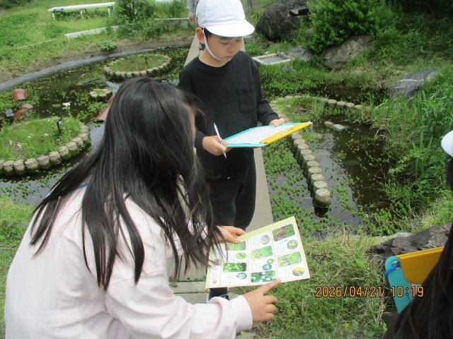 今、理科の学習では生き物を探しに校庭・ビオトープに出ています。探検ボートを持ち、何がいるか、じーーーっくり・・・