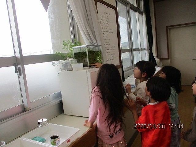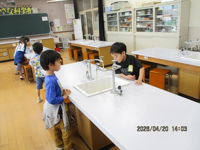 理科室に探検に行きました。入った途端にみんな興味津々!「どうして水道にホースがついてるの?」「ガラスがいっぱい」「メダカがいる!」とたくさん発見して不思議を見つけていました。