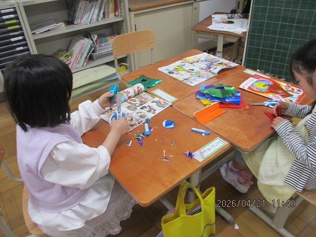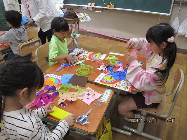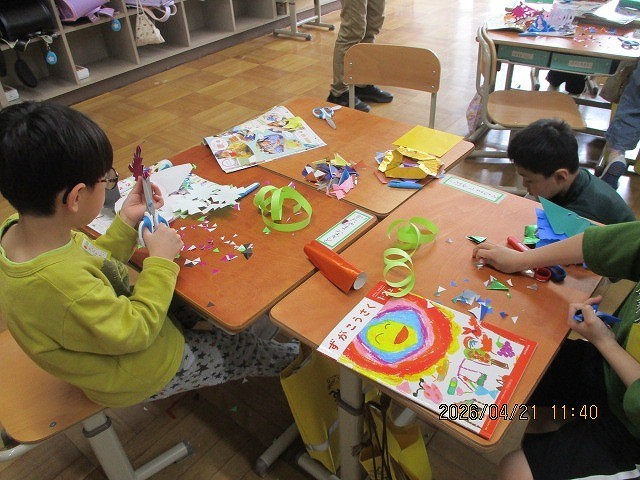 折り紙や紙を折って好きなように切ってできる模様を楽しみました。作業を始めたらどんどん熱中して、たくさんの飾りを作ることができました。授業参観の時にぜひご覧ください。