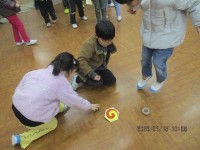 お正月あそびをしました。こま、ふくわらい、かるた、はごいたお手玉などをしてみんな...