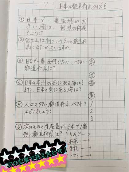 今回は,先生からみんなに,問題を出題します。漢字の問題と都道府県の問題です。