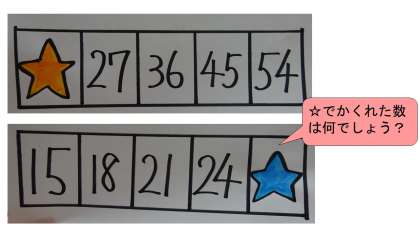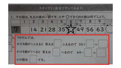 上の図は,九九の表のいちぶです。★でかくれた数は何でしょう??かける数が1ふえると,答えはいくつふえるのかにちゅうもくするといいですよ!