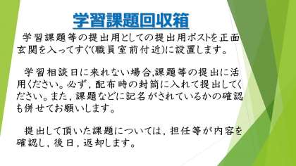 学習相談会に来れない人も,今まで,がんばってお家でやった課題を,担任の先生に見せてほしいと思います。課題回収箱を準備していますので,どうぞ活用ください。