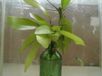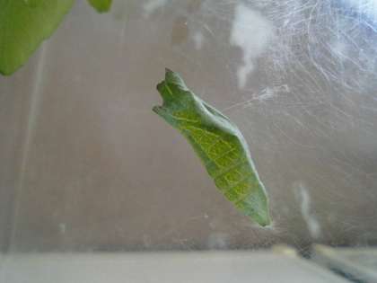 アゲハチョウのさなぎは,虫かごのかべについていて,落ちないようにしっかり糸をはっています。これも虫たちの工夫ですね。