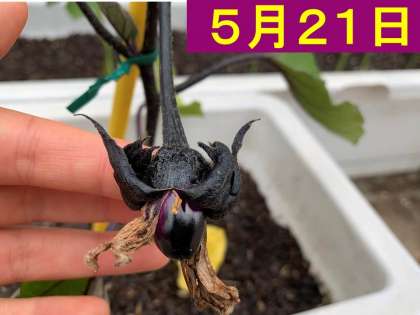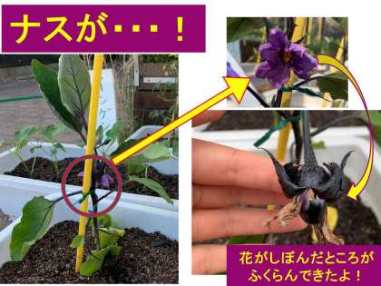 むらさき色の きれいな花が しぼんだと思ったら,だんだん ふくらんで ナスのみが 出てきました。