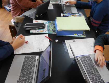 何かなと思って教室を覗いてみると,理科の学習の出口として,『新聞づくり』をしていました。黙々とタブレット型PCを使って検索する人。用意してくれていた「れき岩」や「化石」をうつしている人。