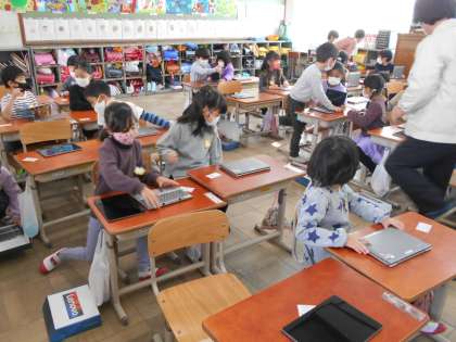各学年タブレット端末を使った学習に取り組んでいますが,1年生もタブレット端末を使う学習を始めています。