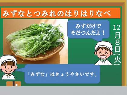 「ひじき豆」は,鉄やカルシウムを多く含み,「みず菜とつみれのはりはり鍋」とごはんがよく合い美味しい献立でした。