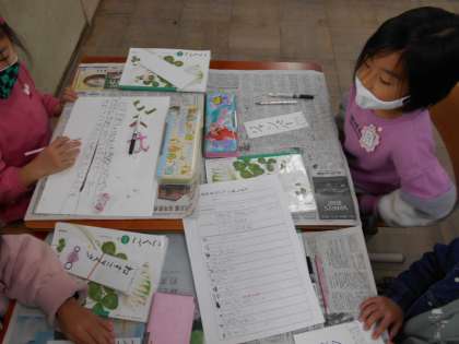 学習した,ひらがな,カタカナ,漢字を使って丁寧に書いていました。たくさんお客さんが来てくれるように,看板になる画用紙には,おすすめの商品が書いてありました。