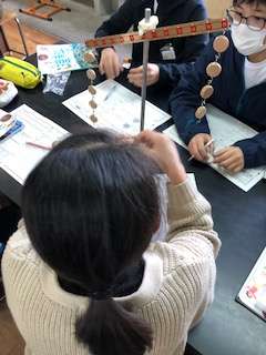 前の授業で,「支点から力点の距離」や「支点から作用点の距離」により手応えが変わることが分かったので,今日は実験用てこを使って,右のうでと左のうでが水平になるのはどんなときかを調べました。