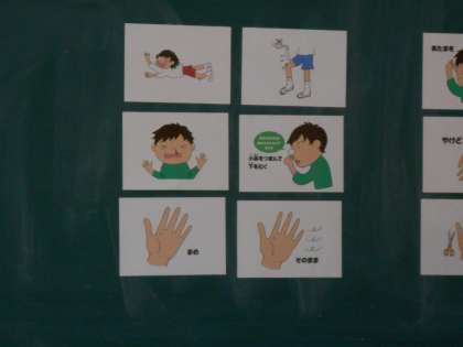 今日は,1年生が教室で養護教諭から,日常でよくあるけがの応急手当の方法について学びました。