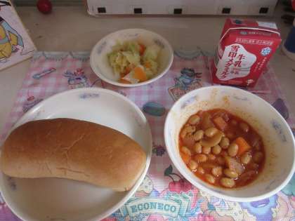 今日の給食は「黒糖コッペパン・牛乳・大豆と鶏肉のトマト煮・野菜のホットマリネ」でした。黒糖コッペパンは,ほんのり甘くておいしかったです。