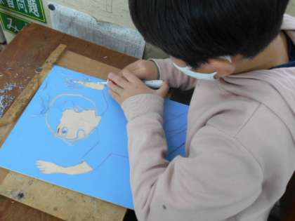 三角刀や小丸刀,丸刀を使い分けながら,版を彫っていきました。彫りすぎたりはみ出したりしないように,しっかりと集中して活動に取り組んでいました。また,先生や友達のアドバイスをきき,工夫して版を彫れています。出来上がるのが今から楽しみです。