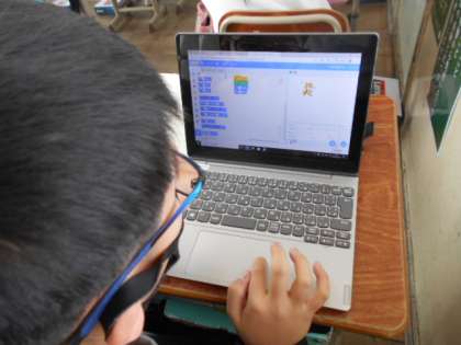 正方形の描き方の手順をみんなで確認した後,どのようなプログラムで四角形が描けるかを考え,作成しました。実際に四角形を描く際,説明する言い方と,プログラミングでの言葉の違いに,最初は困惑していた子どもたちでしたが,先生や友達の説明,板書をしっかりと活かして規則性に気づき,四角形を描プログラムを作成していました。「分かった!」「楽しい!」という声がたくさん聞こえてきました。