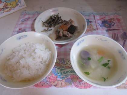 今日の給食は1月のなごみ献立で正月料理の「ごはん・煮しめ・ごまめ・京風みそ汁」でした。