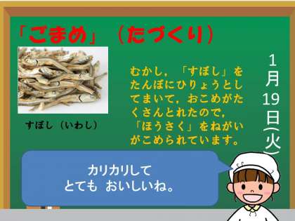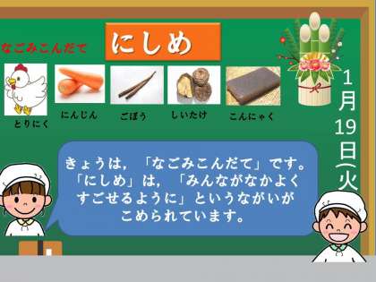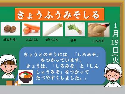 子どもたちが食べやすいように「信州味噌」と合わせて使いました。また,春の七草の一つ「せり」を入れました。